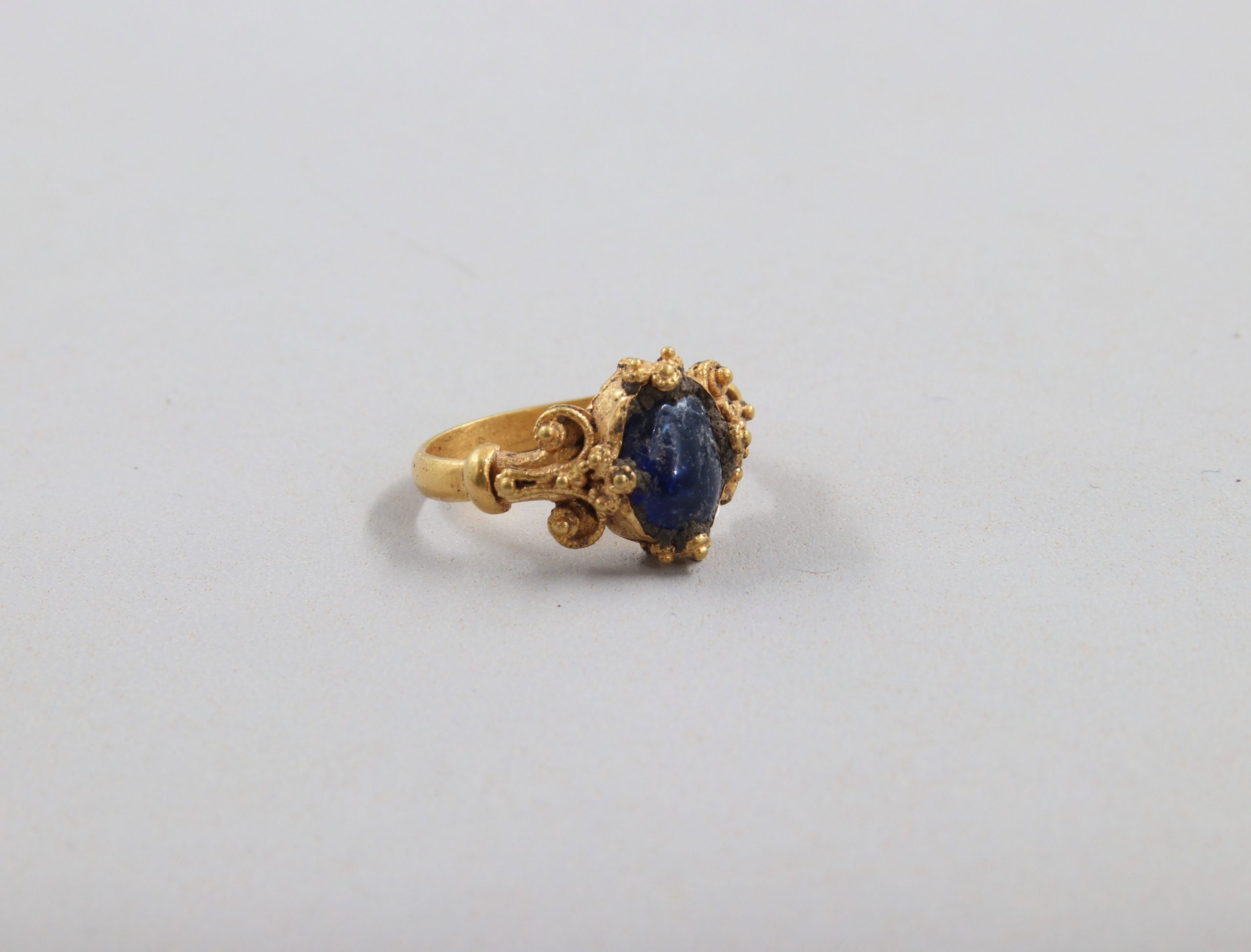 El anillo de oro tiene una piedra ovalada, posiblemente un zafiro, por su color azul intenso. Delgados hilos de oro entrelazados en un intrincado diseño flanquean la piedra, y se han soldado pequeñas bolas de oro como adornos adicionales.